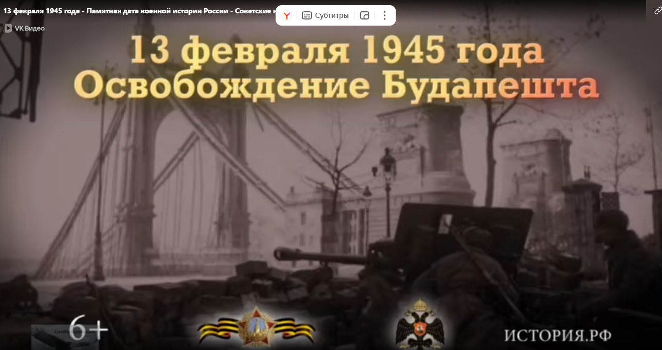 К 13 февраля — Памятная дата военной истории России. В этот день в 1945 году советские войска окончательно освободили столицу Венгрии — Будапешт. Материалы по ссылке: https://yandex.ru/video/preview/8995336273534506364